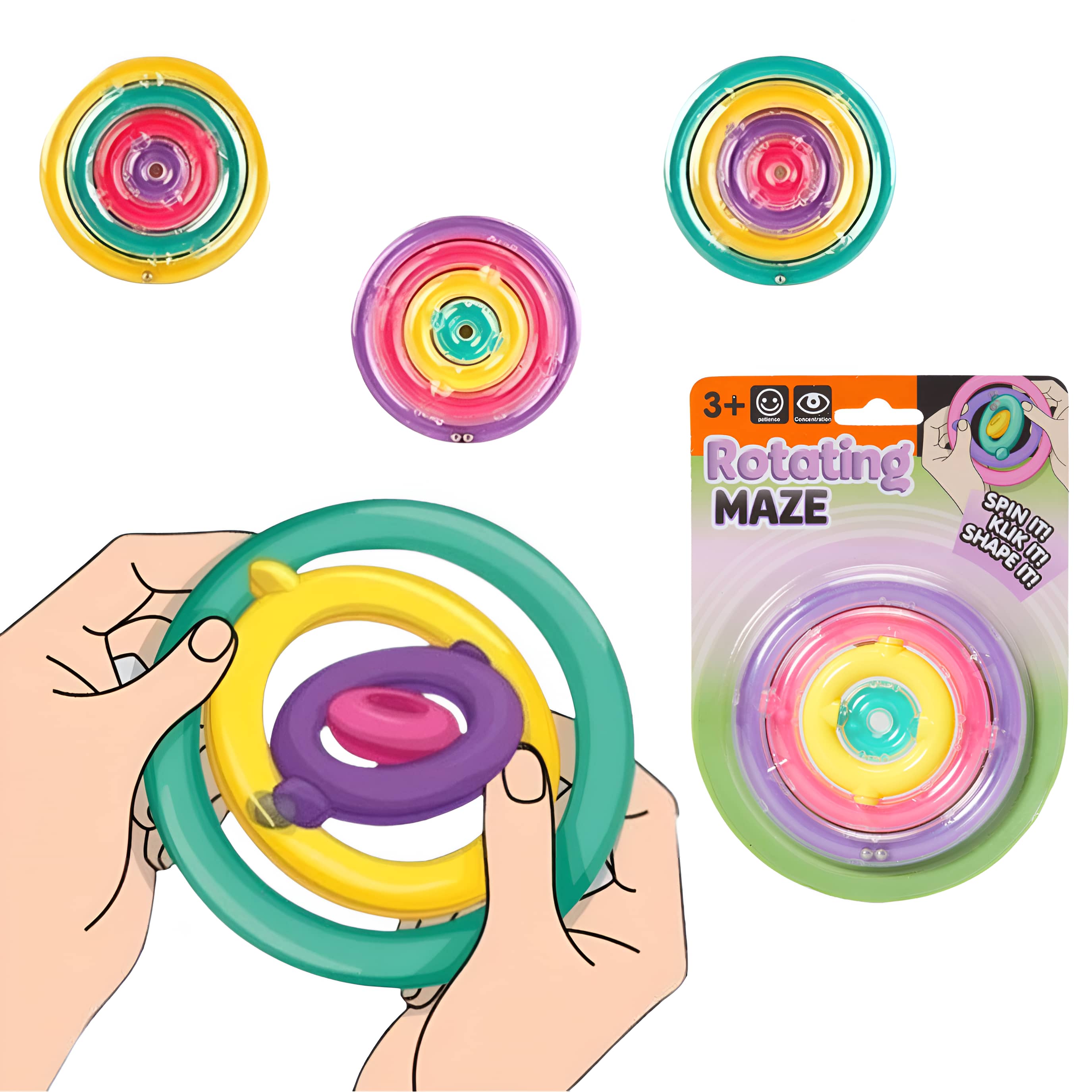 El Laberinto Rotatorio Sensorial es un juguete de destreza y enfoque diseñado para desafiar la paciencia, la motricidad fina y la coordinación ojo-mano. Consiste en una base circular con anillos interiores. El objetivo es guiar la bola a través del complejo recorrido girando la base del laberinto para manipular la gravedad y el camino.